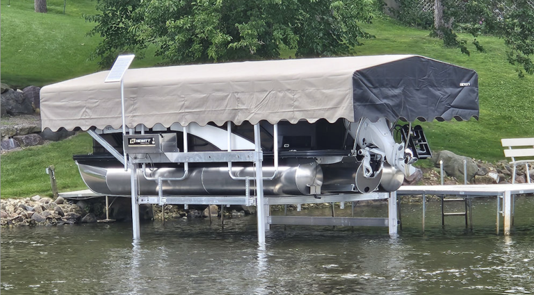 The Hewitt Aluminum Vertical Hi-Lift 6600# is an extra-wide lift with a 120” inside width. It features a 24V Integrated Lift Boss Motor with a key fob, solar power, batteries, and a mesh end canopy. This lift provides superior strength and convenience, making it an ideal choice for those seeking effortless boat storage. The bunk setup and canopy length are determined by the specific boat, ensuring a perfect fit for secure and stable storage.